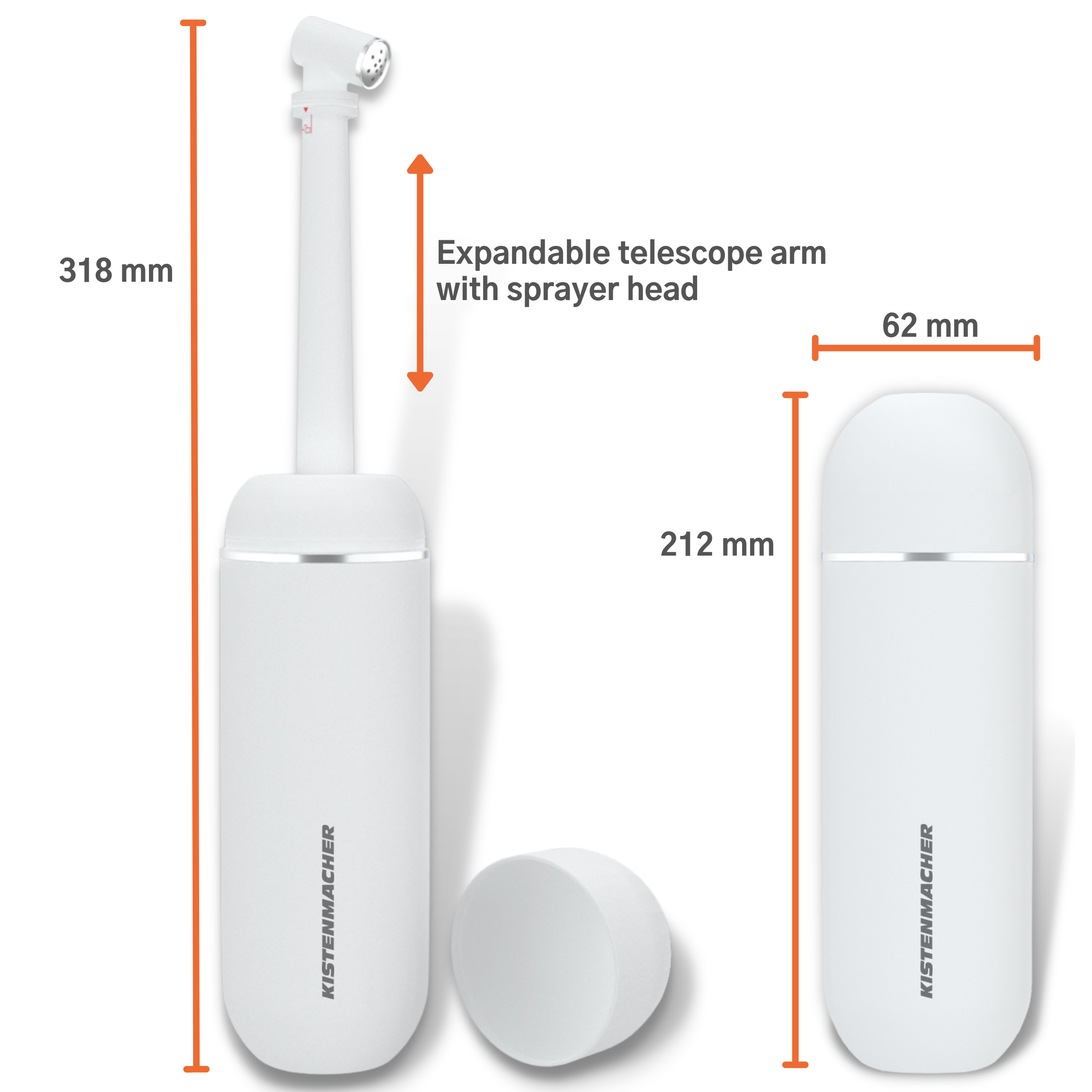 - For transportation the telescope arm with integrated sprayer head can be easily folded into the bottle